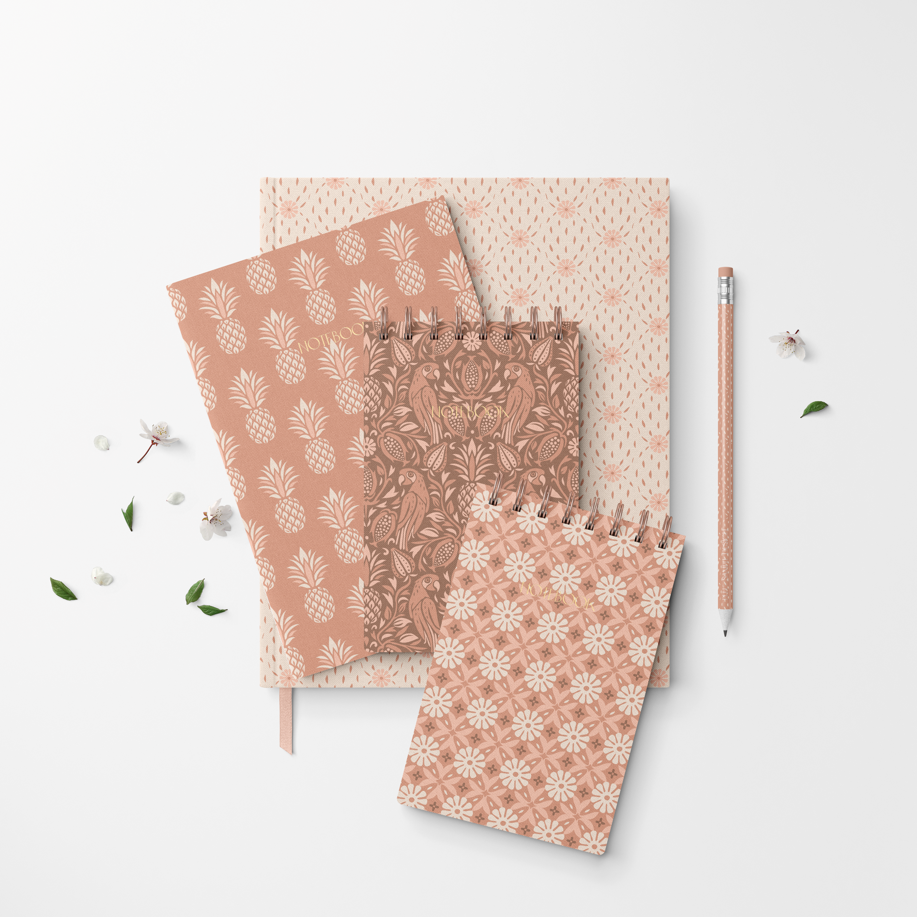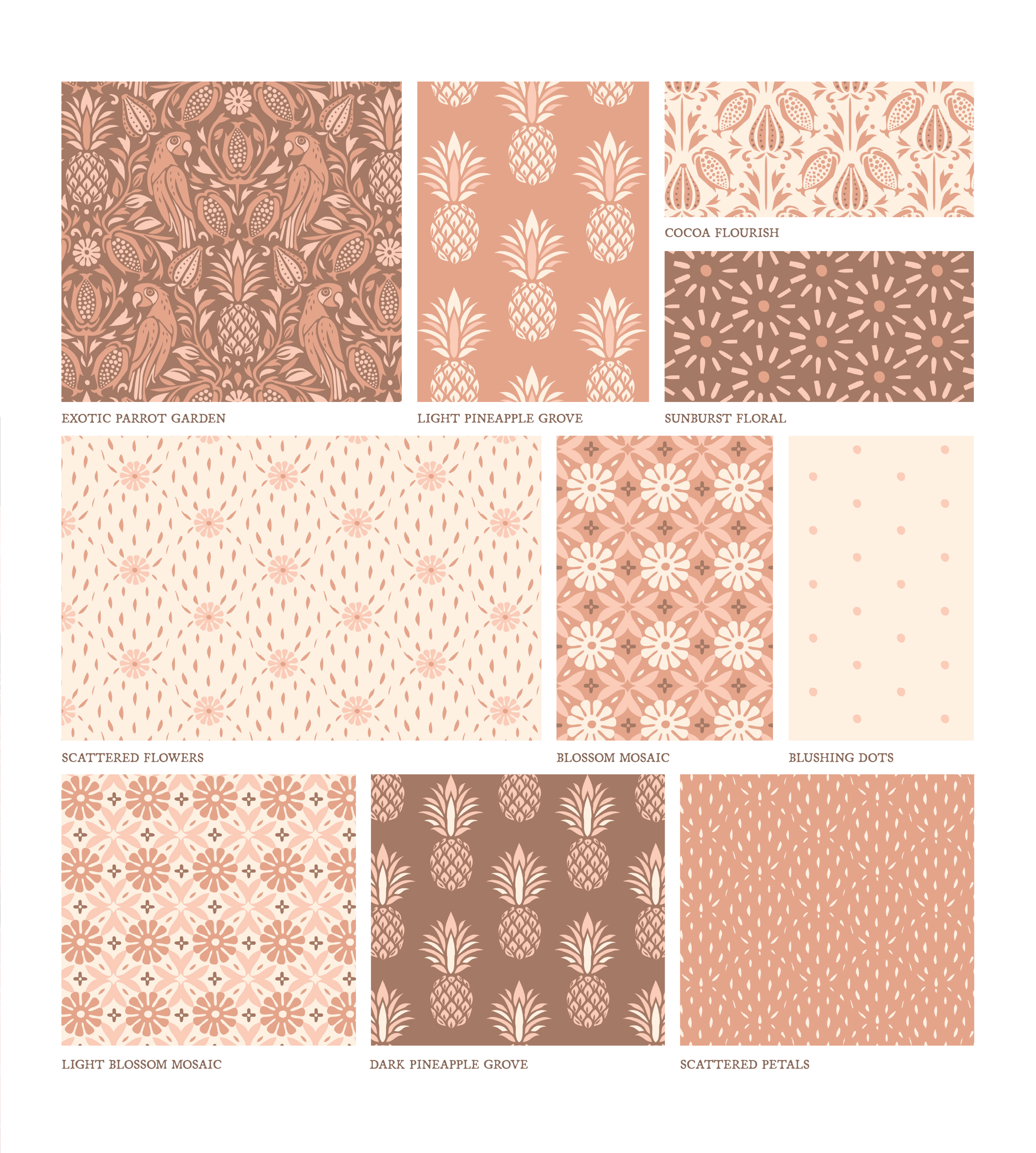 Tropical Mocha Mousse is a warm and inviting collection inspired by tropical motifs and vintage elegance. It features a harmonious blend of lush pineapples, exotic parrots, stylized cocoa pods, and intricate florals, all tied together by the earthy warmth of Mocha Mousse, the 2025 color of the year.